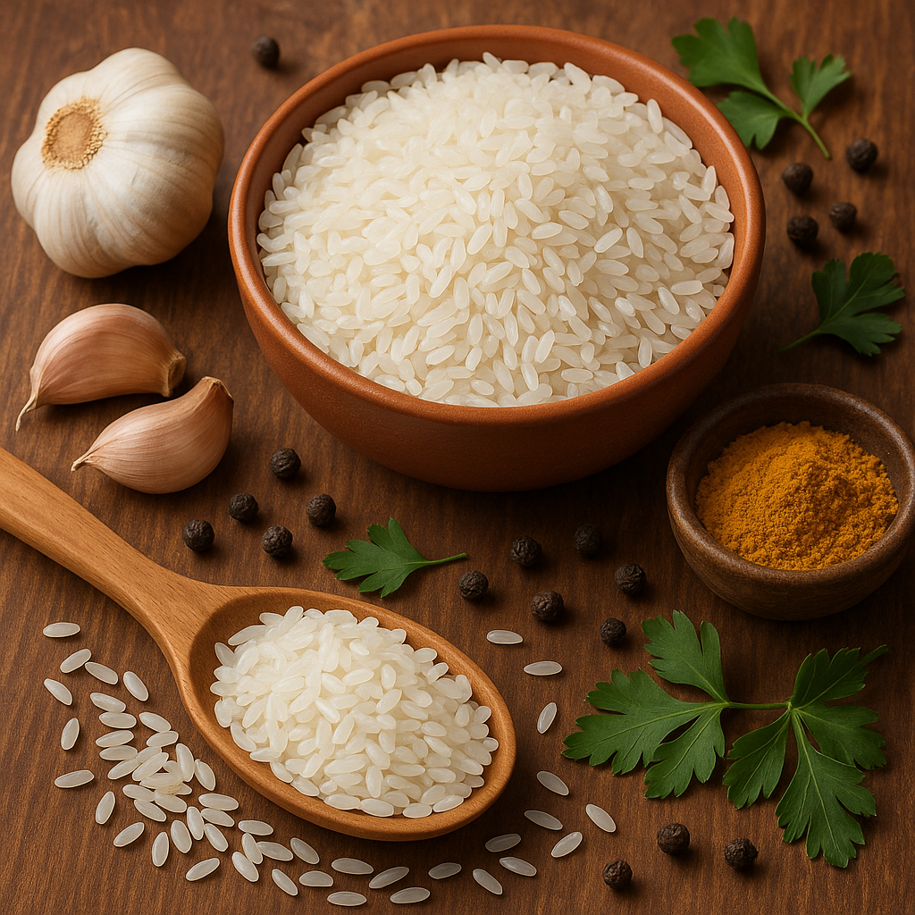 Arroz parabolizado: Não lave o arroz. Ferva a água com os temperos e adicione o arroz em água fervente. Para cada medida de arroz, adicione 2 1/2 medidas de água. Quando estiver quase seco pingue algumas gotas de vinagre. Quando secar pingue mais umas gotas de vinagre a apague o fogo. Deixe descansar por 10 minutos e sirva.