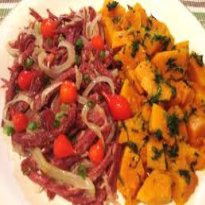 - Numa fôrma refratária, coloque uma camada generosa da abóbora refogada. Por cima, coloque a mistura da carne seca.