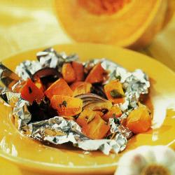 - Preaqueça o forno a 220ºC. Forre um tabuleiro com uma folha grande de papel-alumínio. Arrume a abóbora e as cebolas no centro do papel. Como alternativa, prepare 4 folhas de papel-alumínio e asse a abóbora em envelopes individuais.