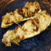 - Arrume as metades de abobrinha numa assadeira e recheio com o refogado