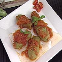 - Recheie as abobrinhas com essa mistura e leve para cozinhar em uma panela já aquecida com água, o molho de tomate, folhas de hortelã, um pouco de azeite e os dentes de alho com casca