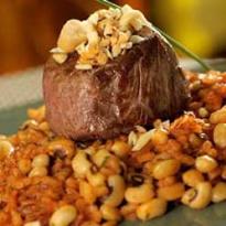 - Em um prato colocar o baião e o filé-mignon, polvilhar com amendoim ou castanha de caju.