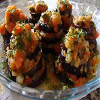 - Num prato, alterne camadas de berinjela com o molho por cima. Finalize polvilhando salsa.