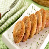 - Modele bifinhos, no formato de mini-hambúrgueres, passe pelo ovo batido e a farinha de rosca