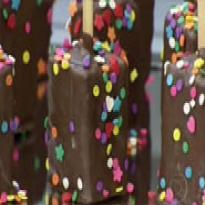 - Banhe os pirulitos de bolo no chocolate ao leite derretido segurando pela ponta do palito
