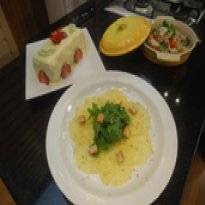 - Colocar uma camada de sorvete, uma de doce de leite e outra de sorvete e finalizar com uma fatia de bolo