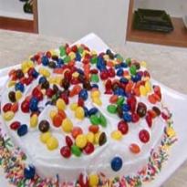 - Parta o bolo ao meio e coloque o recheio, depois a cobertura e decore com os confetes.