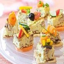 A base do canapé pode ser cenoura, torrada de pão sírio, biscoito amanteigado, rodela de pepino, meio tomate cereja, etc. Os enfeites também podem variar