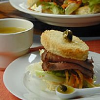 - Coloque as torradas em um prato e distribua por cima as folhas de alface e o rosbife dobrado em quatro partes