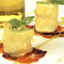 - Arrume os canelones de abobrinha nos pratos, regue com o molho da assadeira e com o azeite oliva restante.