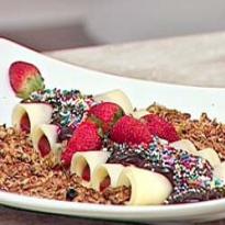 - Enrole como canellones, cubra com a calda de chocolate, coloque a granola, os flocos de chocolate, os confeitos prateados e decore com morangos.