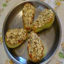 - Quando o chuchu estiver cozido, resfri-os, retire os miolos, coloque num refratário e espalhe o molho de tomate sobre eles.