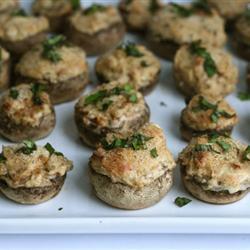 - Com a ajuda de uma colher pequena, preencha os chapéus dos cogumelos com esta pasta. Arrume eles na assadeira forrada.