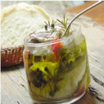 - Com delicadeza disponha as sardinhas, as pimentas-dedo-de-moça e os grão de pimenta-do-reino e o ramos de alecrim em um recipiente de vidro esterilizado com tampa (capacidade para 1 e 1/2 litro)