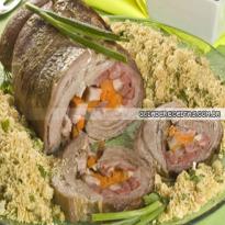 - Arrume o bacon, a calabresa, o queijo, a cebola e a cenoura sobre a carne
