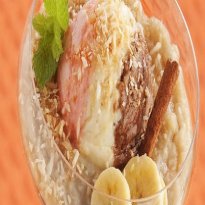 - Em cada taça reservada, coloque 1 bola do sorvete Napolitano, polvilhe o restante do coco ralado e decore com uma folha de hortelã