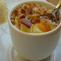 - Coloque em potinhos individuais e cubra com uma camada de farofa, que você prepara misturando 1 xícara de chá de farinha, 1/2 xícara de chá de açúcar e uma colher de sopa de manteiga