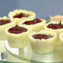 - Em forminhas de empada forradas com saco plástico coloque uma porção de massa de queijos e com a ponta dos dedos modele na fôrma