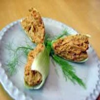 - Distribua a pasta, dentro dos talos de ervas-doces e arrume-as em uma assadeira (23 cm x 33 cm).