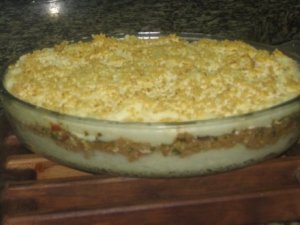 - Em um refratário untado com azeite, coloque uma camada do purê de mandioca, o refogado da proteína de soja, o tofu temperado, salpique orégano e termine com o restante do purê.
