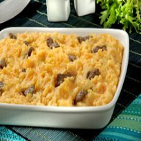 - Em um refratário retangular pequeno (26 X 16 cm), untado, espalhe metade do purê, as iscas de carne e cubra o purê restante