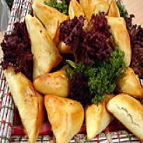 - Pegue pedacinhos da massa, abra com um rolo, recheie com um pouco de carne e aperte as pontas em formato de triângulos