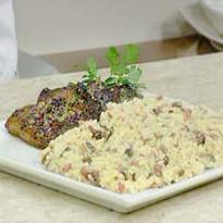 - Coloque um pouco de manteiga numa panela e refogue o salaminho com as passas, acrescente o arroz e o molho branco