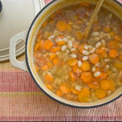 - Junte as cebolas, o alho, a cenoura, o tomate e o alecrim. Tempere com o sal e a pimenta. Leve ao fogo alto até ferver, diminua a chama e cozinhe em fogo brando até o feijão amolecer, aproximadamente 1 hora.