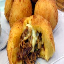- Com uma colher de sopa pegue pequenas porções da massa, abra com as mãos e no centro coloque um pouco de costela desfiada, um cubo de queijo meia cura e feche a massa formando uma bolinha