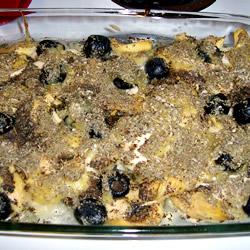 - Coloque os peitos e as coxas de frango em uma assadeira de 23 x 33 centímetros com o lado do osso para baixo. Espalhe as alcachofras e as azeitonas em torno do frango e, em seguida, adicione o vinho e o caldo. Polvilhe com estragão e tempere com sal e pimenta a gosto.