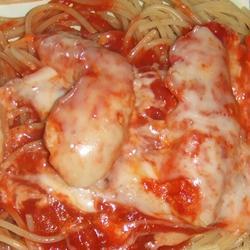 - Acrescente o molho de tomate, tampe a frigideira e mantenha-a no fogo por mais 10 minutos, ou até que o frango esteja cozido. Jogue por cima o queijo ralado, tampe a frigideira novamente e cozinhe o filé de frango por mais 2 a 3 minutos, até que o queijo derreta. Sirva quente.