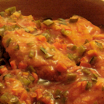 - Despeje o molho de tomate sobre a carne. Cubra com papel alumínio. Leve ao forno quente (200ºC) preaquecido por uns 40 minutos. Retire o papel alumínio e asse por mais 20 minutos.