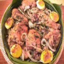 - Coloque então as fatias de pão no fundo da travessa e sobre elas os pedaços de galinha e os temperos do refogado