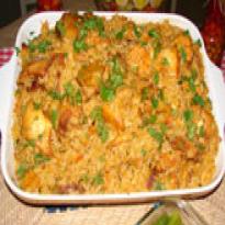 - Doure os pedaços de galinha no óleo junto com a cebola, o alho e o louro