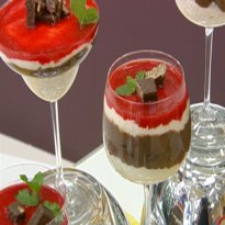 - Em taças coloque uma camada de sorvete de creme, uma camada de creme de chocolate (feito acima) e uma camada do sorvete de creme. Com as costas de uma colher alise bem o sorvete e leve as taças ao congelador por +/- 1 hora. Na hora de servir, retire as taças do freezer 30 antes e sirva com calda de morango.