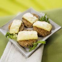 - Retire do forno, cubra cada um com 1 fatia do queijo de minas frescal, coloque sobre ela outro hambúrguer e leve ao forno por mais 5 minutos ou até derreter o queijo.