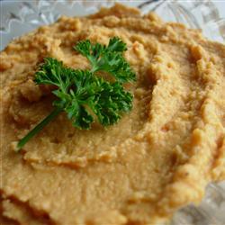 - Em um liquidificador ou em um processador de alimentos, ponha o grão-de-bico com o pimentão vermelho, o suco de limão, o tahine, o alho, o cominho, a pimenta-caiena e o sal. Bata usando a tecla pulsar. A pasta de grão-de-bico deve ficar bem cremosa e bem leve. Use uma espátula para lraspar as paredes do liquidificador ou processador. Transfira o homus para uma vasilha e deixe-o na geladeira por pelo menos 1 hora (o homus pode ficar até 3 dias na geladeira) Antes de servir, deixe-o em temperatura ambiente. Polvilhe o homus com a salsa picada e se quiser, regue-o com azeite.