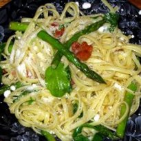- Numa frigideira limpa, ponha o azeite. Acrescente o alho e o aspargo, deixe que cozinhem em fogo médio por aproximadamente 3 minutos, mexendo de vez em quando. Adicione o linguine. Coloque o macarrão numa tigela grande e misture-o com a rúcula, o suco de limão e o bacon. Sirva a seguir.