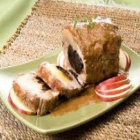 - Coloque entre cada fatia do lombo uma fatia de maça e algumas ameixas
