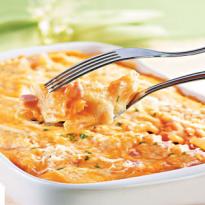 - Unte um refratário com margarina, coloque camadas de macarrão, presunto e molho