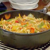 - Coloque a cenoura cortada fina, a cebola, a vagem, os pimentões e o repolho