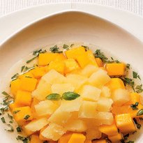 - No momento de servir, distribua entre quatro bolws os cubinhos de manga na borda e cubinhos de picolé no centro