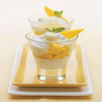 - Leve à geladeira por 3 horas ou até que o creme fique consistente. Decore com as tiras de manga e a hortelã. Sirva em seguida.
