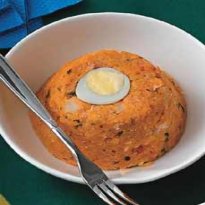 - Em 12 forminhas de 6,5 cm de diâmetro e 4 cm de altura untadas com óleo, coloque 1/2 ovo de codorna e preencha com a massa