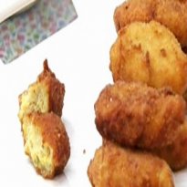 - Com as mãos pegue pequenas porções da massa, modele no formato desejado, passe na farinha de trigo, depois nos ovos batidos e na farinha de rosca