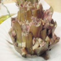 - Distribua-a em as alcachofras, colocando recheio no meio e entre as pétalas.