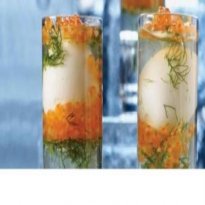 - Junte 1 cm de ovas de peixe, depois um ovo de codorna cozido, adicione a preparação com a gelatina delicadamente e deixe endurecer
