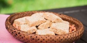 - Retire da geladeira e corte a paçoca em quadradinhos.