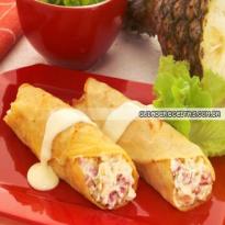 - Em uma tigela, misture os ingredientes do recheio, divida entre as massas e enrole como rocambole.