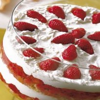- Cubra com metade do morango reservado e, por cima, espalhe metade do creme batido reservado.